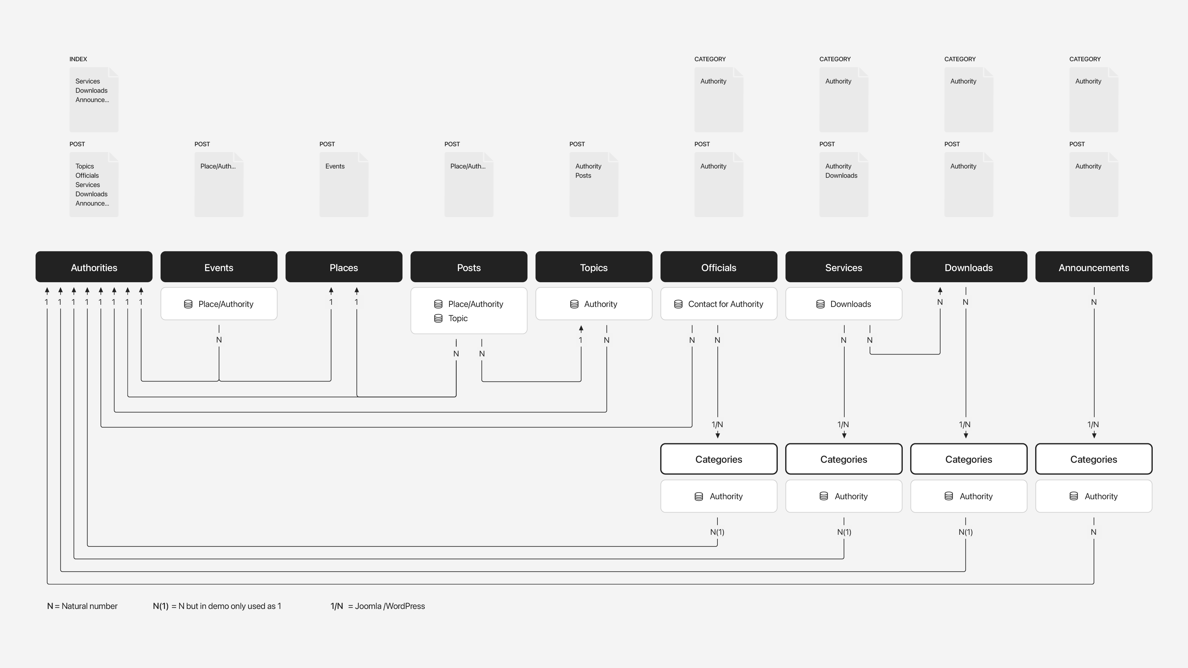 Downloads and announcements are similar. The related authority is set in the category and displayed in the sidebar on the category and single item pages. On the authority page, their latest downloads appear in the sidebar, while latest announcements are shown below grouped by their category.